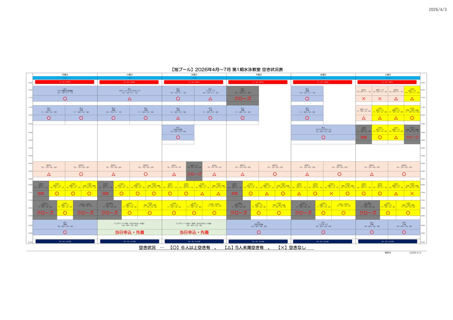 水泳・体操教室 【令和8年度第1期 水泳&体操教室 申込状況】 ※4月3日現在※ 一部、クローズとなっております。 予めご了承ください 【令和8年度第1期定期水泳・体操教室お知らせ】 【子供水泳】 【成人水泳】 【成人体操教室】 級変更の案内 子ども水泳教室級変更表 令和7年度4月より子ども水泳教室の級が変更になります。 左側【旧級設定】右側【新級設定】